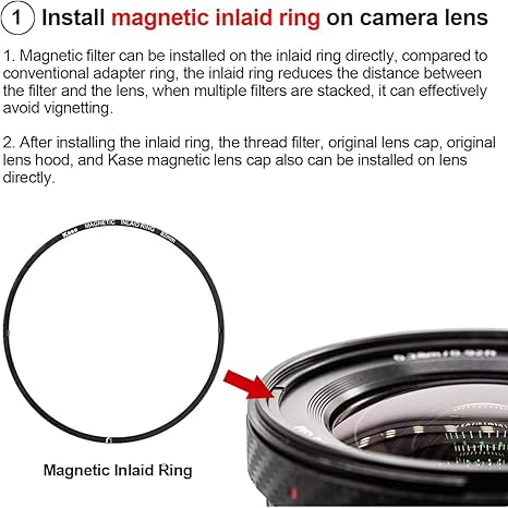 - When the inlaid ring is installed on lens, compared to conventional adapter ring, the inlaid ring reduces the distance between the filter and the lens, when multiple magnetic filters are stacked, it can effectively avoid vignetting.
