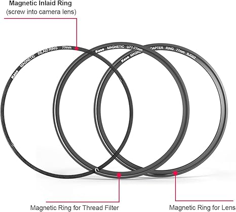 - The Kit includes 3 magnetic adapter rings, a magnetic ring for 77mm thread filter, a magnetic ring for 77mm camera lens and a 77mm magnetic inlaid ring.